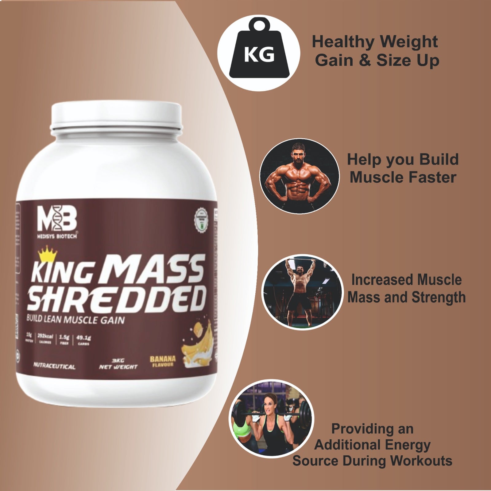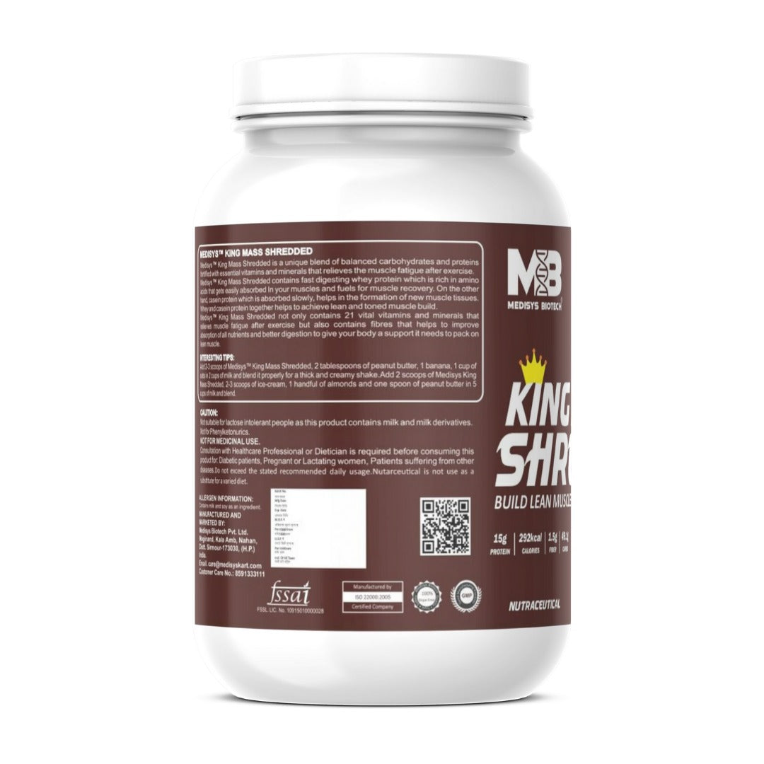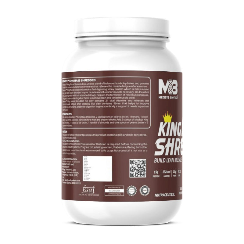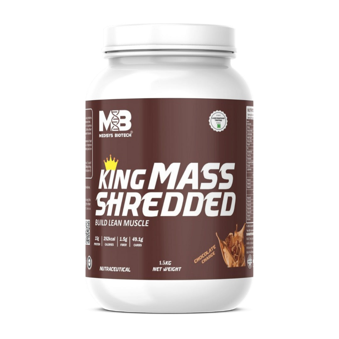 Medisys King Mass Shredded is a premium mass gainer designed to help individuals build lean muscle mass effectively. With a balance of high-quality protein, carbohydrates, and essential nutrients, it supports muscle growth and recovery while minimizing fat gain.