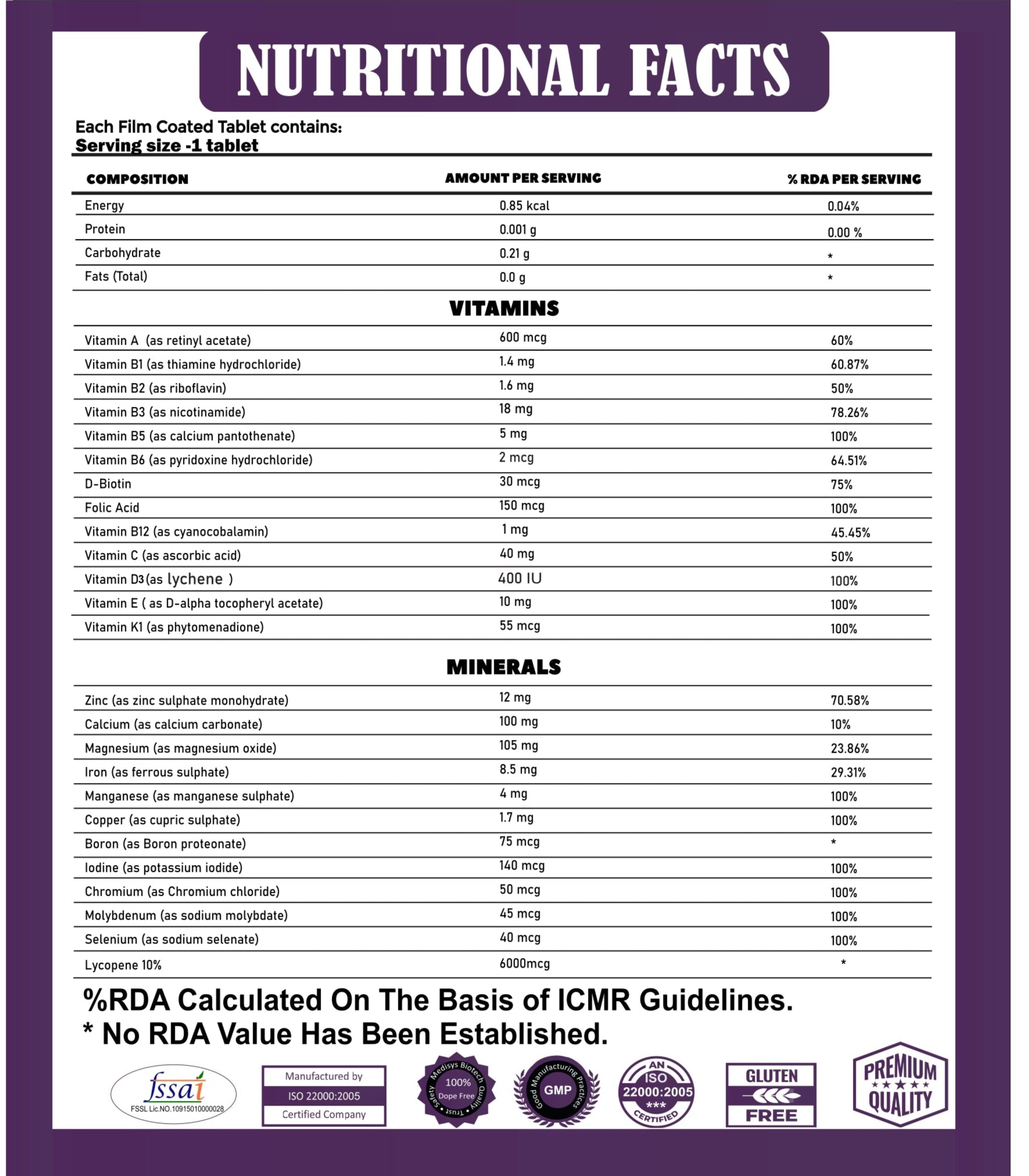 Multivitamin: A blend of essential vitamins and minerals designed to support immunity, energy production, and overall well-being.